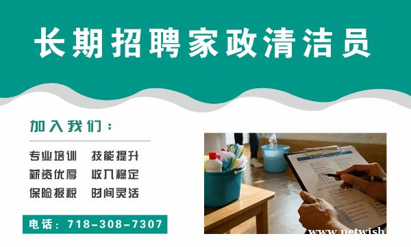 公司提供稳定客源、合理薪资、准时结算,欢迎踏实肯干、有责任心的清洁人员长期合作。 联系我时,请说是在NetWish美国分类信息看到的,谢谢!